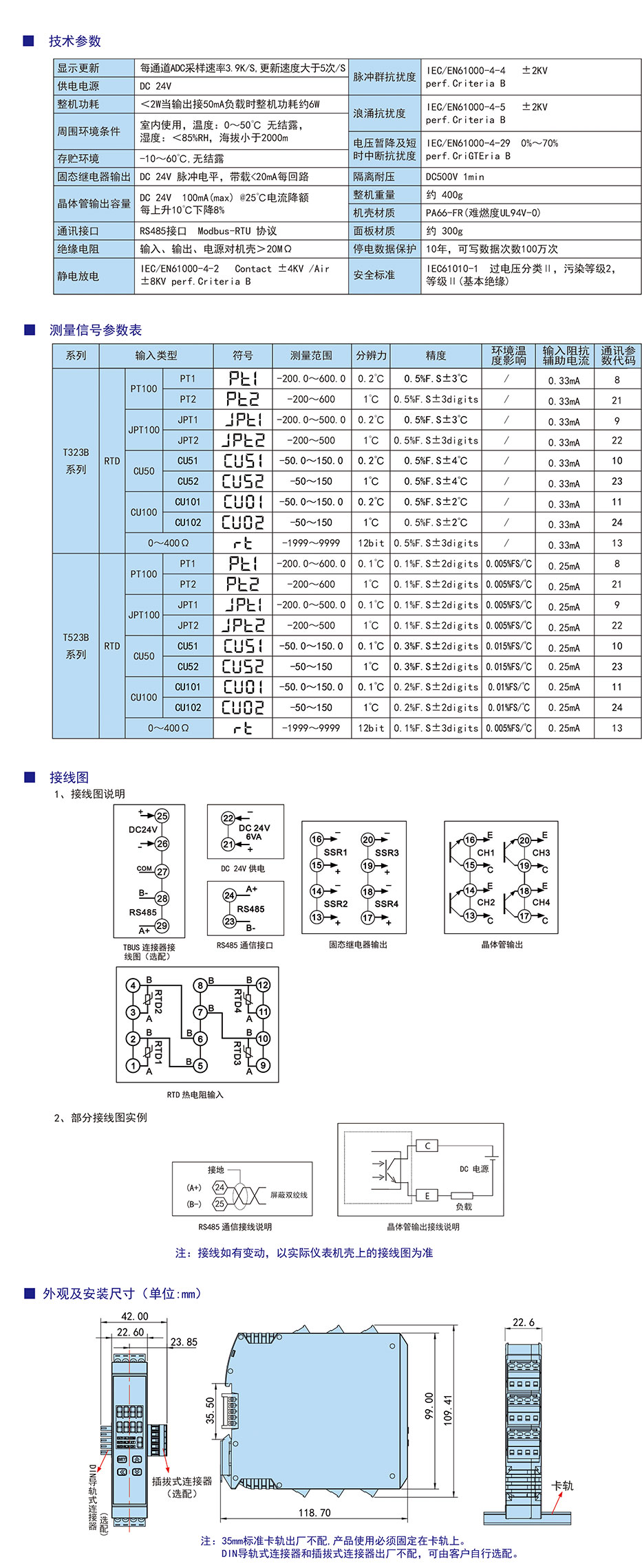多種熱電阻信號類型可選,信號輸入間弱隔離,可接地式探頭;三線式熱電阻輸入。