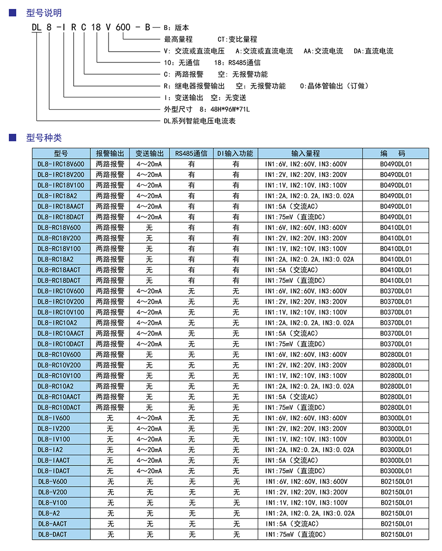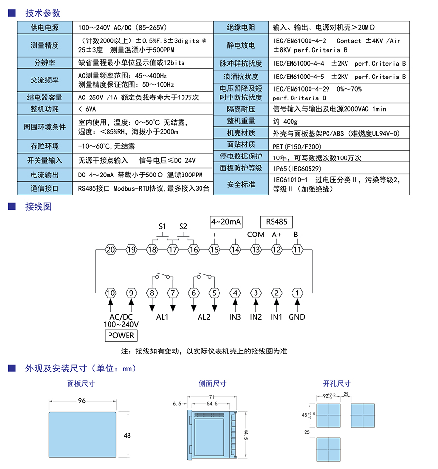 兩路開關(guān)量輸入(DI),可選兩路報警輸出,4~20mA變送輸出,RS485通信功能